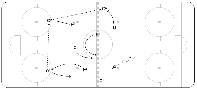 Рисунок 7.16. Перемещающийся в отдалении игрок забрасывает шайбу в центр, а D1 концентрируется.