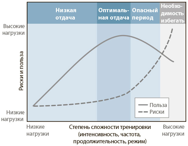 Спортсмены, чьи тренировки проходят с повышенным риском для здоровья, довольно часто срываются из-за интенсивного режима. Они постоянно испытывают упадок сил из-за «слишком больших вложений» и крайне редко реализуют свой потенциал. На другом конце кривой находятся те немногие, кто проводит короткие тренировки с малой интенсивностью, то есть занимается только в режиме низких нагрузок. Из-за недостаточно усердной подготовки эти спортсмены тоже никогда не приблизятся к реализации своих возможностей. Нужно чем-то рискнуть, чтобы достичь максимально возможных успехов. Однако важно контролировать этот риск: без этого тоже к победе не прийти.