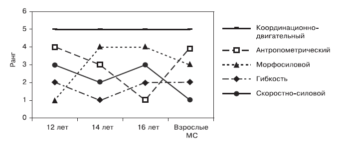 Рис. 79. Ранжирование факторов, влияющих на скорость полета мяча при броске, у гандболисток разного возраста