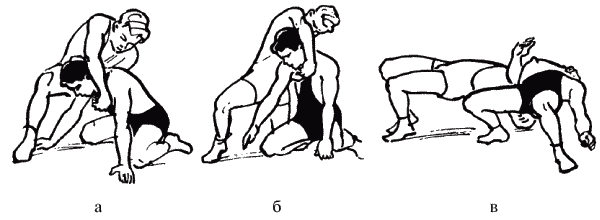 Когда атакующий, выполнив рывок руками за шею, например, с левым плечом и прогибаясь назад, выбросит (или выставит) правую ногу вперед, контратакующий быстро отталкивается правой рукой от ковра и одновременно отбрасывает ноги назад. Ложась рядом с атакующим, он прижимает к себе левой рукой его правую руку и вынуждает лечы на спину.