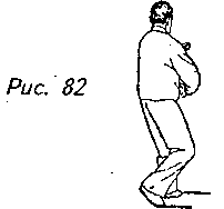 Движение 1 (продолжает рис. 81): Поверните верхнюю часть корпуса немного влево, соедините обе руки в позицию “обхватывание мяча” на уровне груди с левой рукой сверху. Одновременно с этим придвиньте правую ступню к левой, касаясь земли кончиками пальцев (рис. 82).