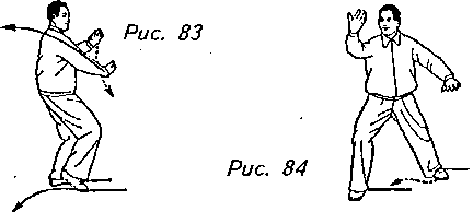 Движение 2: Поверните корпус тела вправо, делая правой ногой шаг вперед и вправо, и перенесите на нее центр тяжести, переходя на правый “шаг вдоль кромки радуги”. Одновременно с этим разведите руки в стороны — правая рука движется вправо и вверх до уровня глаз с ладонью, направленной под углом вверх, а левая рука опускается к левому бедру, с ладонью, направленной вниз, и пальцами, вытянутыми вперед. Взгляд обращен на правую ладонь (рис. 83, 84).