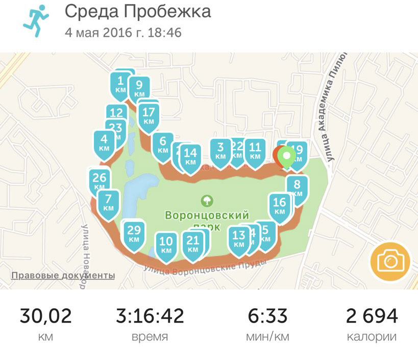 Я никогда столько не пробегал и не знал, что меня ждет там дальше, за 25-м километром дистанции. Становилось не по себе, подумал, что если я тут упаду, то не смогу даже никуда позвонить, а найдут меня случайные прохожие в лесополосе только утром. С этими мыслями в голове я пробежал еще пять километров. Жутко устав, но впервые в жизни пробежав 30 км за 3 часа 16 минут, я зафиксировал результат в Runkeeper, после чего мне уже было не страшно, что телефон отключится: свою задачу сохранить тренировку он выполнил.