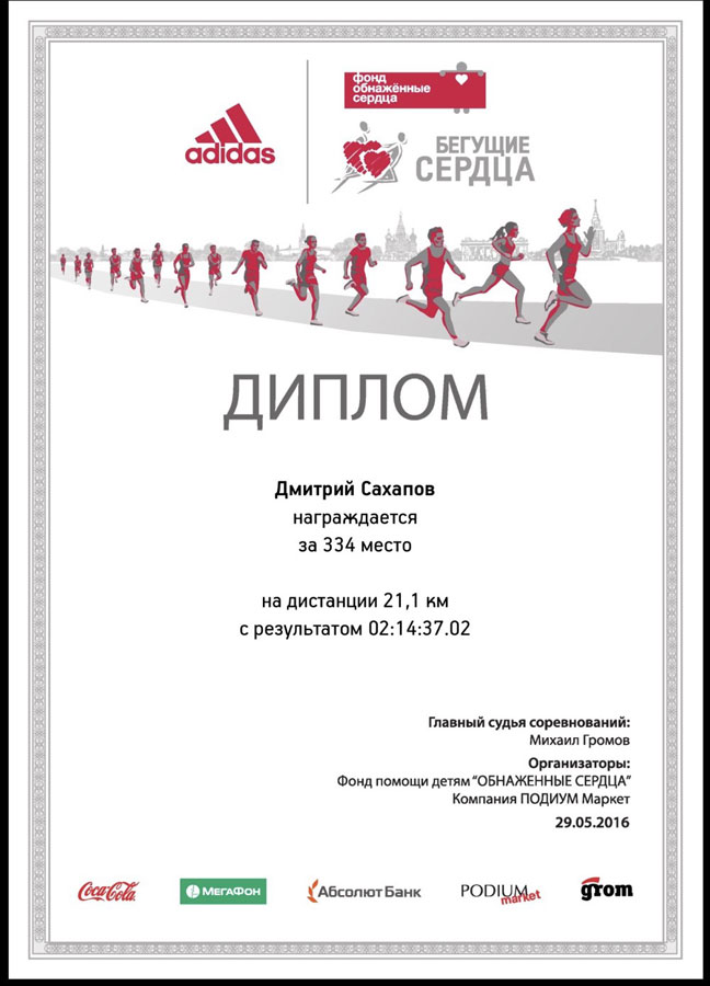 И следствием этого стал результат – 2 часа 14 минут. Да, к своей исходной цели выбежать из двух часов я даже и близко не подобрался! Конечно, я не мог быть доволен таким итогом, но все-таки ощущение сопричастности к большому благотворительному беговому празднику сгладило горечь разочарования в результате. Все-таки забег Adidas «Бегущие сердца» – это больше благотворительный старт, чем спортивный. Поэтому я был рад, что также внес и свой скромный вклад на благие цели. Кроме того, я получил бесценный опыт, который меня многому научил и, безусловно, пригодился впоследствии.
