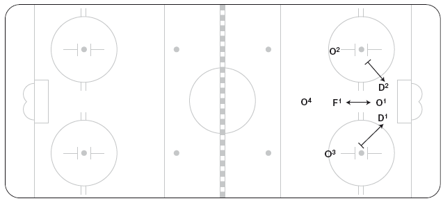 При игре в большинстве «четверо против троих» львиная доля команд выстраивается ромбом с одним игроком у ворот, поэтому расстановка бригады меньшинства треугольником с одним игроком дальше от ворот – самая эффективная система, которую можно использовать. F1 остается в центре площадки (рисунок 10.26). Когда шайба оказывается у линии входа в чужую зону, он остается лицом к лицу с защитником команды противника. Шайба передается другому игроку, F1 остается в центре и с помощью клюшки исключает возможность паса от О2 к О3. D1 и D2 готовы рвануть и перекрыть линии бросков от O2 и О3. D1 и D2 не связываются с О1 у ворот, они намерены отражать его клюшку и блокировать соперника туловищем, если будет совершен бросок из-под игрока.