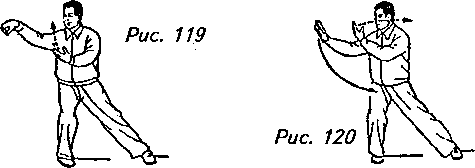 Движение 1 (продолжает рис. 118): Перенесите вес своего тела на правую ногу, поверните пальцы левой ноги внутрь и медленно поворачивайте верхнюю часть корпуса вправо. В это время левая рука должна пройти поперек живота и подниматься вверх до тех пор, пока не окажется прямо перед правым плечом, направленная ладонью к телу. Правая кисть распрямляется, открытая ладонь направлена от себя. Взгляд по-прежнему направлен на левую ладонь (рис. 119, 120).