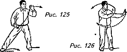 Движение 4: Медленно перенесите вес своего тела на левую ногу и проведите левую руку перед лицом влево, держа ладонь под углом тоже влево, затем опустите правую ладонь перед животом и поднимайте до тех пор, пока она не окажется прямо напротив левого плеча, внутренняя сторона кисти при этом повернута к корпусу. Одновременно с этим придвиньте правую стопу к левой и удерживайте их параллельно на расстоянии 4—5 дюймов (10—12 см) друг от друга. Взгляд направлен на правую руку (рис. 125, 126).