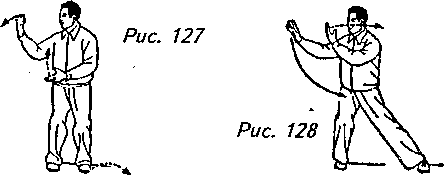 Движение 5: Медленно перенесите вес своего тела на правую ногу и проведите правую руку перед лицом вправо, держа ладонь направленной вправо под углом, затем опустите левую ладонь перед животом и поднимайте до тех пор, пока она не окажется точно напротив правого плеча, внутренняя сторона кисти при этом повернута к корпусу. Одновременно с этим поверните правую ладонь направо и сделайте левой ногой шаг влево. Взгляд теперь переведите на левую руку (рис. 127, 128).