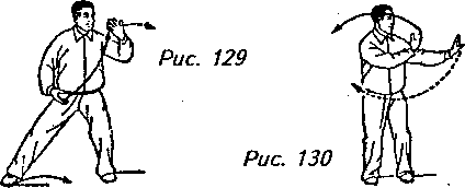 Движение 6: Медленно перенесите вес своего тела на левую ногу и проведите левую руку перед лицом влево, держа ладонь под углом тоже влево, затем опустите правую ладонь перед животом и поднимайте до тех пор, пока она не окажется прямо напротив левого плеча, внутренняя сторона кисти при этом повернута к корпусу. Одновременно с этим придвиньте правую стопу к левой и удерживайте их параллельно на расстоянии 4—5 дюймов (10—12 см) друг от друга. Взгляд направлен на правую руку (рис. 129, 130).