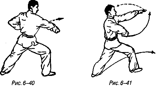 Движение не прекращается, корпус поворачивается вправо, одновременно левая рука распрямляется, обращенная центром вниз, левая ладонь с кончиками пальцев в качестве точки приложения силы наносит укол вперед (рис. 6-41).