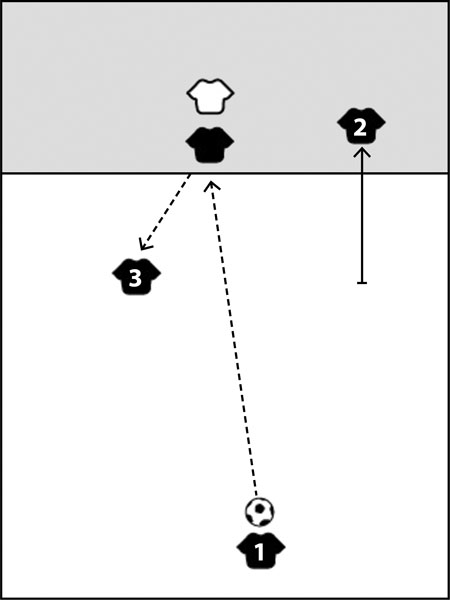 Схема 9.1. Белый участок поля ниже нападающего является той зоной, передача в которую станет «лучше, чем поперек поля». Нападающий принимает мяч, за его спиной защитник соперника наседает на него, а нападающий № 2, забежав ему за спину, оказался в позиции, где он уже не в состоянии помочь партнеру. Нападающий № 3 предлагает себя под передачу ниже. Он упростил задачу игроку с мячом, позволив отдать пас, находясь лицом к нему, а также предоставив ему право сыграть немного неточно.