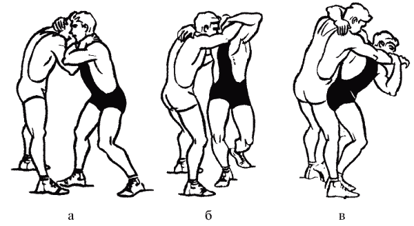 «Выход» – с поворотом на носке сзади стоящей ноги, вынос впереди стоящей ноги мимо противника на стартовое положение (снаружи одноименной ноги противника) (рис. 1.6.а, б, в). Этим способом удобно выходить на старт броска проворотом в условиях одноименной и разноименной взаимной стойки.