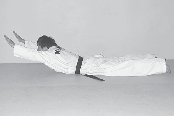 б) лежа на животе, одновременный подъем прямых ног и вытянутых перед собой рук.