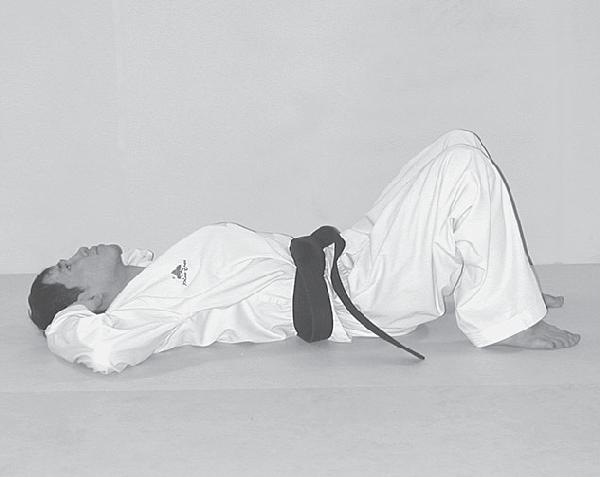 Техника выполнения: примите исходное положение – лежа на поверхности, руки согнуты в локтях и расположены на затылке, ноги согнуты в коленном суставе, стопы плотно прижаты к поверхности около ягодиц.