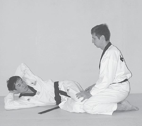 Техника выполнения: упражнение выполняется в паре с партнером. Примите исходное положение – лежа на спине, руки согнуты в локтевом суставе и расположенных на затылке, ноги выпрямлены вперед, попросите партнера сесть вам на ноги.