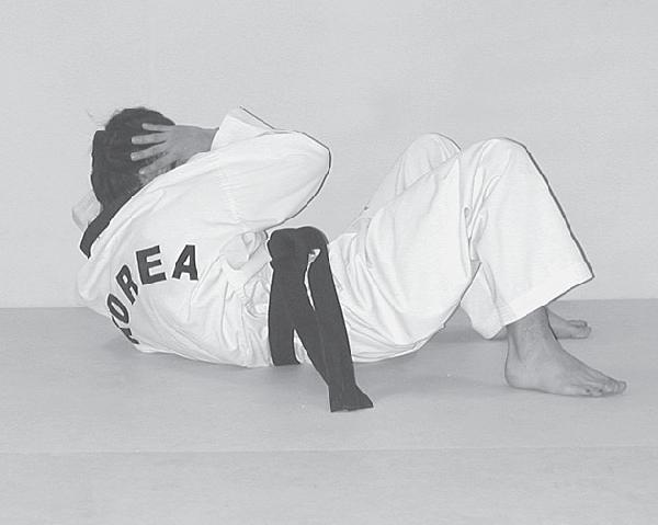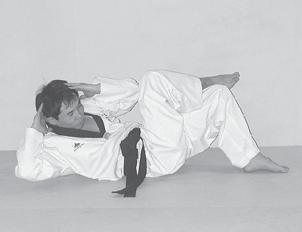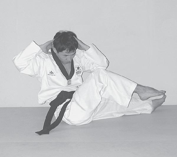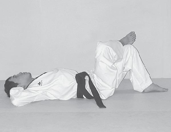 Техника выполнения: примите исходное положение – лежа на спине, руки согнуты в локтевом суставе и расположены на затылке, левая нога согнута в колене, стопа прижата к поверхности, правая нога также согнута в колене и стопой прижата к бедру левой ноги, правое колено направлено в сторону.