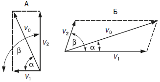 Следующей величиной, от которой зависит результат прыжка, является угол вылета, который определяется с помощью касательной к траектории полета в точке вылета или путем сложения векторов скорости, приобретенной в разбеге (V1) и в отталкивании (V2). В результате сложения получается начальная скорость полета (Vо), направление которой с горизонталью и образует угол вылета ? (рис. 5).