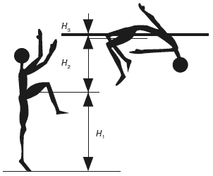 H1 – высота расположения ОЦМТ в момент отрыва от опоры, H2 – вертикальное перемещение ОЦМТ после отрыва от опоры. Сумма двух вышеуказанных составляющих (H1+H2) – это максимальная высота, на которую поднимается ОЦМТ спортсмена во время прыжка. H3 – эффективность перехода планки, т. е. расстояние между (H1+H2) и планкой. Последняя составляющая может являться как положительной, так и, в большинстве случаев, отрицательной величиной. Рассмотрим в отдельности вышеперечисленные компоненты.