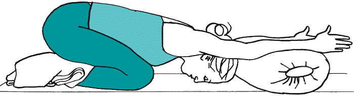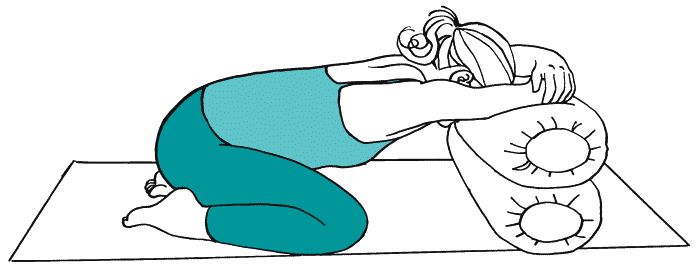 Вариация с болстерами. Положите поперек коврика 2 болстера, один поверх другого, и опустите на них голову, чтобы она находилась выше таза (рисунок 22Б). Эта вариация подходит беременным женщинам, так как дополнительный болстер позволяет свободно дышать и создает пространство для чувствительной груди и растущего ребенка. Обхватите локти ладонями и положите руки и голову на опору.