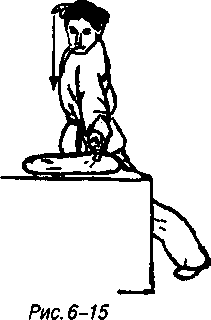 Встать лицом к столу, ноги расставить на ширину плеч, корпус поворачивается вправо, одновременно левая рука сверху с кончиками пальцев в качестве точки приложения силы наносит вперед-вниз резкий вцепляющийся удар по мешку (рис. 6-15).