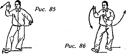 Движение (продолжает рис. 84): Сделайте полшага вперед левой ногой и перенесите на нее вес своего тела, затем поднимите правую ногу и упритесь ее пяткой в землю, а колено чуть согните, образуя правый “свободный шаг”. Выполняя эту часть упражнения, передвиньте правую руку от правого бока к лицу до уровня бровей, держа ладонь направленной влево. Левая же рука должна пройти около внутренней стороны правого предплечья с ладонью, развернутой вправо, до уровня груди. Взгляд должен быть обращен в сторону правой ладони (рис. 85, 86).