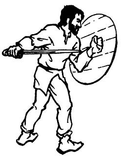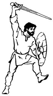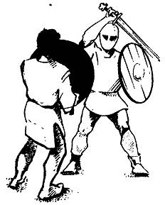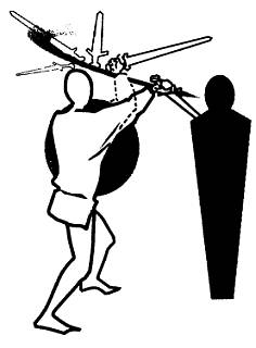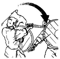Сложный (ломаный) удар сверху. Точки атаки: голова, грудь. Клинок в начале движения совершает реверс (разворот). Траектория рассчитана на попадание клинка за щит, параллельно его плоскости.
