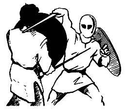 Как только противник попадает в зону реальной досягаемости, следует взрывной удар (с разворотом корпуса в прямую линию плечи — рука — меч). Быстрый хлесткий удар в голову с круговой траекторией клинка и линейной траекторией рукояти. В финальной стадии меч, рука и плечи располагаются на одной прямой.