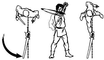 На схемах показаны конечное положение руки и траектория движения меча: клинок совершает вращательное движение (стрелка), а рукоять движется по прямой (пунктир). Основной движущей силой этого удара является энергия скрута корпуса. Следует обратить особое внимание, что правая нога разворачивается коленом внутрь и становится на носок.