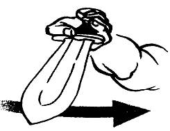Следует обратить внимание на характерное положение кисти, которое мы называем «гусик». Кисть согнута вперед так, чтобы в финальной стадии удара острие было ниже кисти.