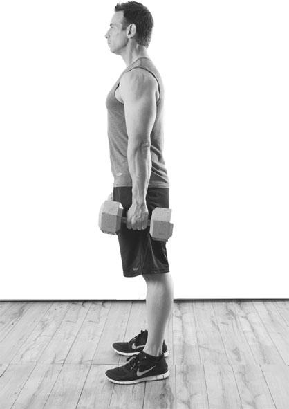 1. Возьмите две гантели одного веса. Расслабьте плечи и держите гантели в свободно опущенных по бокам руках. Немного наклонитесь вперед от поясницы, позволив гантелям повиснуть перед вами.