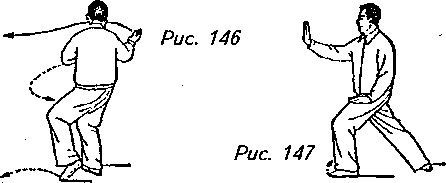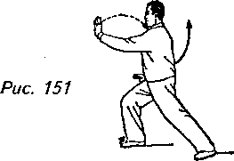 Движение 2: Плавно отведите назад верхнюю часть корпуса и, немного согнув правую ногу, перенесите на нее центр тяжести. Поверните левый носок чуть в сторону от себя и одновременно поверните корпус влево. Затем согните левую ногу, переходя на левый “шаг вдоль кромки радуги”, и подведите правую ногу к левой, не отрывая носка от земли. Сделав это, выверните левую ладонь раскрытой вверх и переведите ее по кривой назад и вверх до уровня уха. Одновременно с поворотом тела верните левую руку к положению перед левым плечом ладонью вниз. Взгляд должен быть в этот момент обращен в сторону левой руки (рис. 148, 149,150).