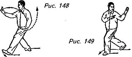 Движение 1 (продолжает рис. 145): Опустите левую ногу и сделайте шаг вперед, перенеся на нее центр тяжести и переходя на левый "шаг вдоль кромки радуги”. Отодвиньте левую руку назад, чтобы ладонь, обращенная вниз, оказалась перед правым плечом, затем поверните правую ладонь вверх и вытолкните ее вперед от правого уха. Одновременно с этим дайте левой руке опуститься до левого колена, круговым движением “почистите” его, доводя ладонь до левого бедра. Взгляд теперь направлен в сторону пальцев правой руки (рис. 146, 147).