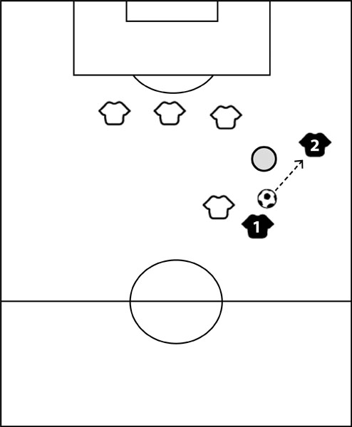 Схема 6.1. Если атакующий игрок стянет на себя крайнего защитника (заштрихованный круг) и отдаст передачу на «переднюю» ногу крайнего нападающего, тот сможет принять мяч за спиной защитника. Если же мяч придет на «заднюю» ногу, он не сможет обострить ситуацию первым касанием.