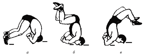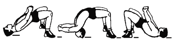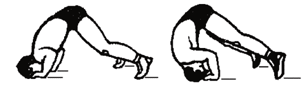 Упражнение выполняется с упором руками и головой в ковер, а в дальнейшем – без помощи рук.