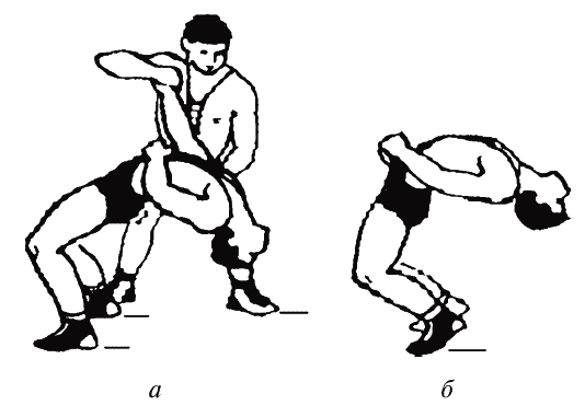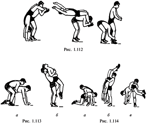 •Борцы стоят лицом друг к другу. Один борец делает наклон вперед, просовывает свою голову между ног партнера, захватывает его бедра снаружи и, выпрямляясь, отрывает его от ковра. Верхний, находясь вниз головой, плотно прижав бедра к шее партнера и согнув руки за головой, выполняет разгибание туловища (рис. 1.111).