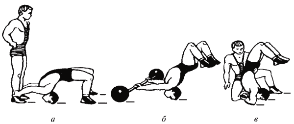 Это же упражнение можно выполнять, удерживая партнера за ноги. Тот, стоя на голове и прижав руки к туловищу, старается не сгибать голову и туловище (рис. 1.119.б, в).