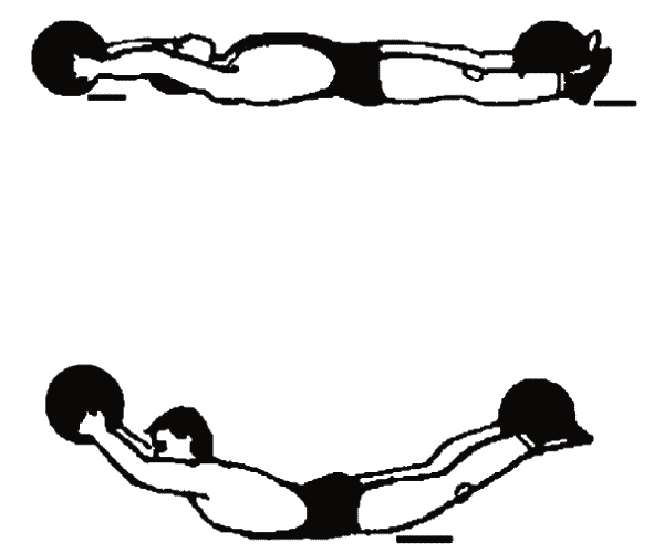 •Боковой перекат. Из положения лежа на спине, ноги и руки вытянуты, поворачиваться на живот, прогибаясь так, чтобы ни руки, ни ноги не коснулись ковра. Упражнение усложняют, держа руками и между ступнями набивные мячи (рис. 1.45).