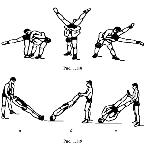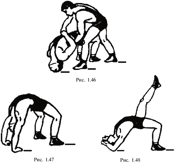 •Борцы стоят лицом друг к другу. Один из них упирается ногой в бедро партнера и сгибает руки за голову. Второй плотно прижимает его ногу к своему бедру. Первый борец выполняет наклоны назад, стараясь встать на мост (рис. 1.120).
