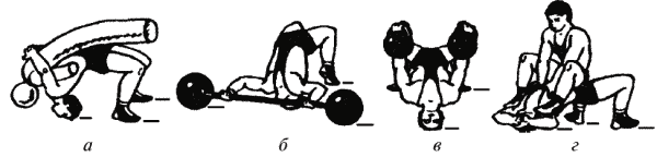 В качестве снарядов применяют тренировочный манекен, штангу (лучше малогабаритную или шаровую), гири. В положении стоя на мосту положить на себя манекен, обхватить его руками и выполнять движения вперед, назад, в стороны (рис. 1.50.а). Эти упражнения можно проводить со штангой (рис. 1.50.б), гирями (рис. 1.50.в) и с партнером (рис. 1.50.г).