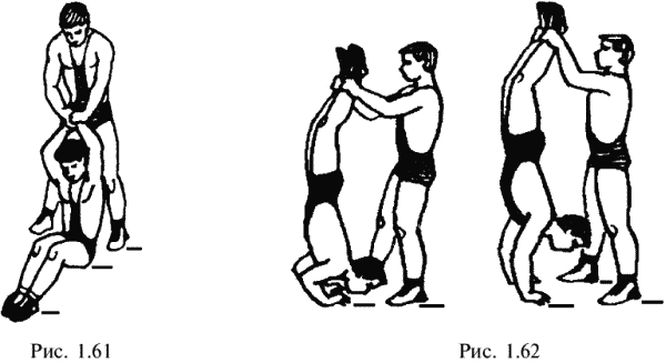 •Один из борцов становится спиной к партнеру, захватывает его за шею и принимает положение виса лежа спиной к ковру. Партнер слегка сгибает ноги в коленных суставах, упирается руками в свои бедра, прогибается в пояснице, отклоняя голову назад. Нижний выполняет подтягивания (рис. 1.66).