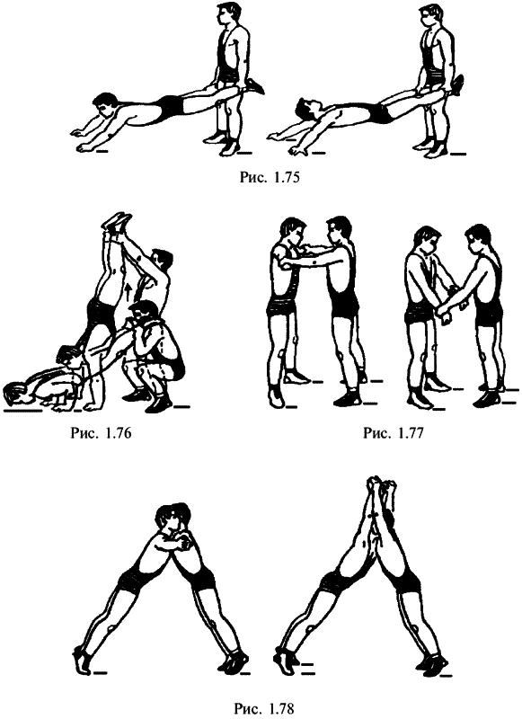 •Один из партнеров в стойке на руках, второй держит его за ноги. Партнеры одновременно выполняют один отжимание, второй приседание (рис. 1.76).
