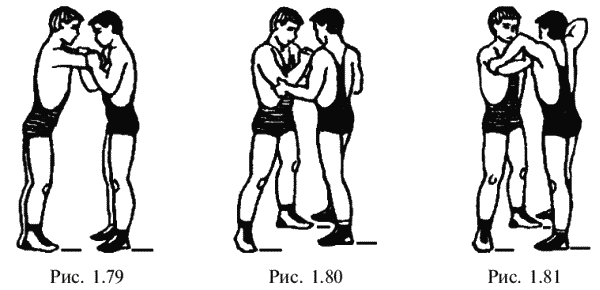 •Борцы стоят лицом друг к другу в положении полуприседа, взявшись за руки скрестным захватом (рис. 1.65).