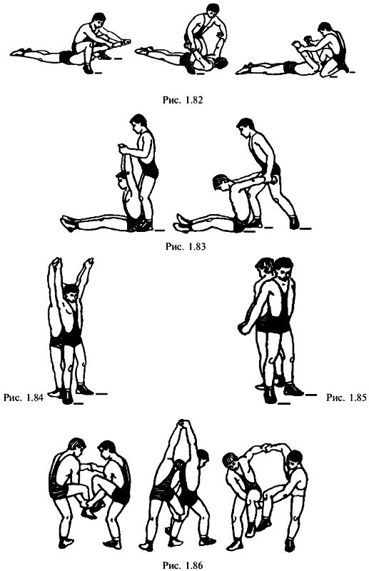 •Один из борцов лежит на ковре лицом вниз с выпрямленными руками. Партнер садится ему на спину, захватив его руки за запястья. Нижний пытается выполнять движения руками (поднимание, опускание, разведение, сведение), преодолевая сопротивление верхнего (рис. 1.82).