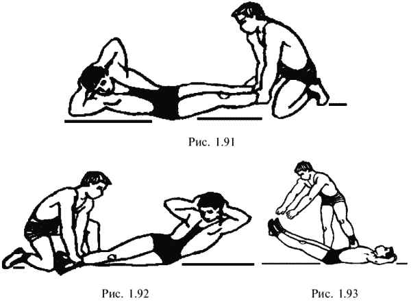 •Подъемы туловища, лежа на спине, руки за головой. Партнер фиксирует ноги (рис. 1.90).