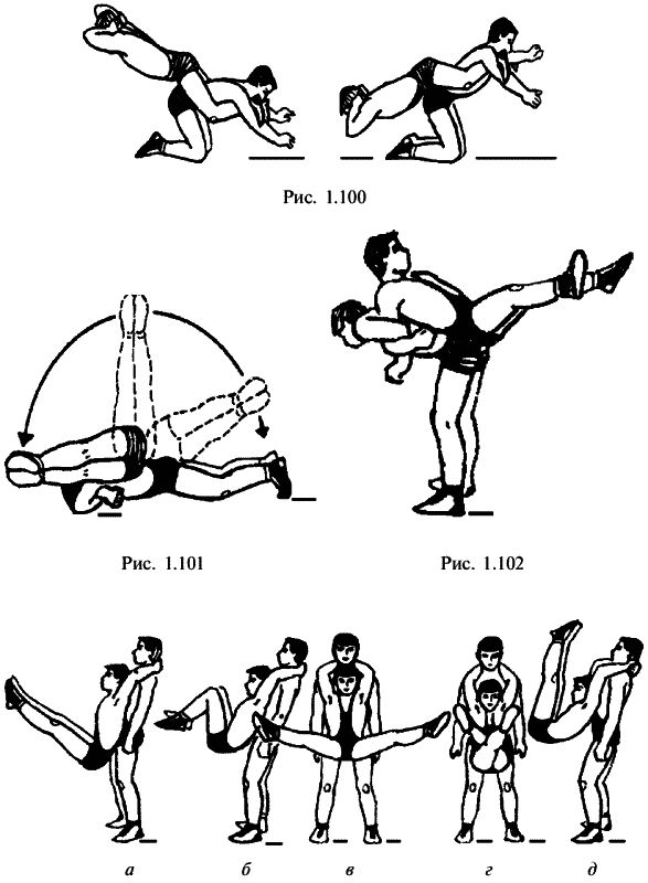 •Борцы стоят спиной друг к другу, зацепившись сгибами локтей. Один из борцов делает наклоны вперед, второй лежит у него на спине (подняв ноги под углом 45° по отношению к своему туловищу) и выполняет различные движения ногами (сведение и разведение, круговые движения, сгибание и разгибание и др.) (рис. 1.102).