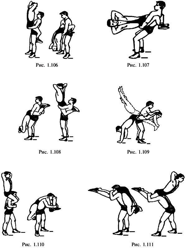 •Один из борцов садится на плечи к партнеру, обхватывает ногами туловище и сгибает руки за голову. Партнер захватывает его ноги за нижнюю часть голеней и плотно прижимает их к своему туловищу. Верхний выполняет разгибание и сгибание туловища (рис. 1.110).