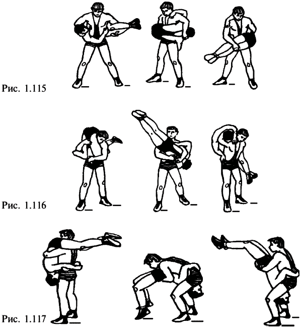 •Прижать партнера поперек к туловищу животом к пояснице захватом шеи и ног за подколенные сгибы (рис. 1.115). Перехватывая захват, вращать партнера вокруг туловища.