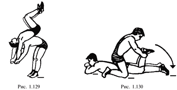 •Стоя спиной друг к другу, соединить вытянутые вверх руки. Один из борцов делает наклон вперед. Второй, сгибая ноги, переворачивается через него (рис. 1.129).