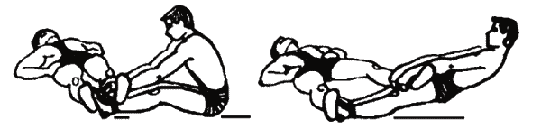 •Один из борцов упирается спиной на плечи партнера, находящегося в положении седа ноги врозь. Борцы берутся за руки, и нижний выполняет пружинистые наклоны вперед.