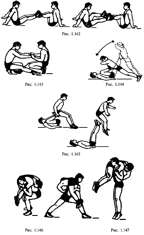 •В положении упора сидя, согнув ноги, упереться подошвами и выполнять попеременное сгибание и разгибание ног, преодолевая сопротивление партнера (рис. 1.142).
